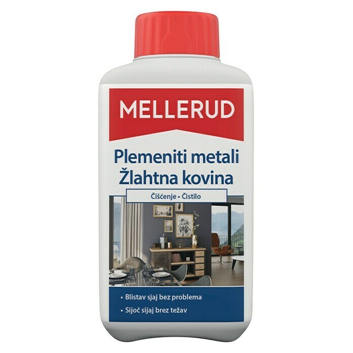 Mellerud sredstvo za čišćenje plemenitih metala čisti predmete od nehrđajućeg čelika i metala. Brzo i temeljito uklanja masne naslage, otiske prstiju, masnoću, ulje, čađu, nikotin i prljavštinu. Nježno uklanja mrlje od vode i kamenac te ne ostavlja ogrebotine na površini. Tretman ne oštećuje nehrđajući čelik ili metal i vraća materijalu njegov izvorni izgled. Može se koristiti na unutarnjim i vanjskim metalnim površinama kao što su nehrđajući čelik, lijevano željezo, cink, aluminij, mesing, bakar i kositar. Čistač je posebno pogodan za čišćenje metalnih površina u kuhinji (štednjak, sudoper, hladnjak i sl.), okvira prozora i polica, poštanskih sandučića, ograda, ručki, lampi i alata. Proizvod jednostavno pošpricajte po površini, ostavite da djeluje kratko vrijeme i zatim čistom mokrom krpom obrišite prljavštinu.