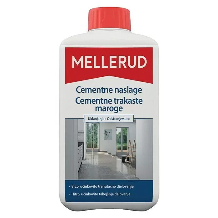 Mellerud odstranjivač cementnih mrlja na mramoru uklanja naslage cementa sa pločica i kamena koje ne podnose proizvode koji sadrže kiseline. Ne sadrži kiselinu i lako otklanja cementni film. Otklanja ostatke cementa, naslage vapna i prljavštinu sa prirodnih i umjetnih vrsta kamena poput mramora, carrara, travertina, jura, granita i teraca. Krupnije komade cementa nakon fugiranja pokupiti metlom. Površinu navlažiti vodom. Sredstvo za čišćenje nanijeti nerazrijeđeno ili u omjeru maks. 1:5, korištenjem pištolja za prskanje ili spužvom. Ostaviti kratko vrijeme da djeluje te spužvom ili grubom krpom pokupiti otopljene ostatke. Nakon toga, površinu dobro isprati vodom. Kod tvrdokornih zaprljanja ponoviti postupak. 1 litra dovoljna je za 20-30 m², ovisno o svojstvima i zaprljanju površine.